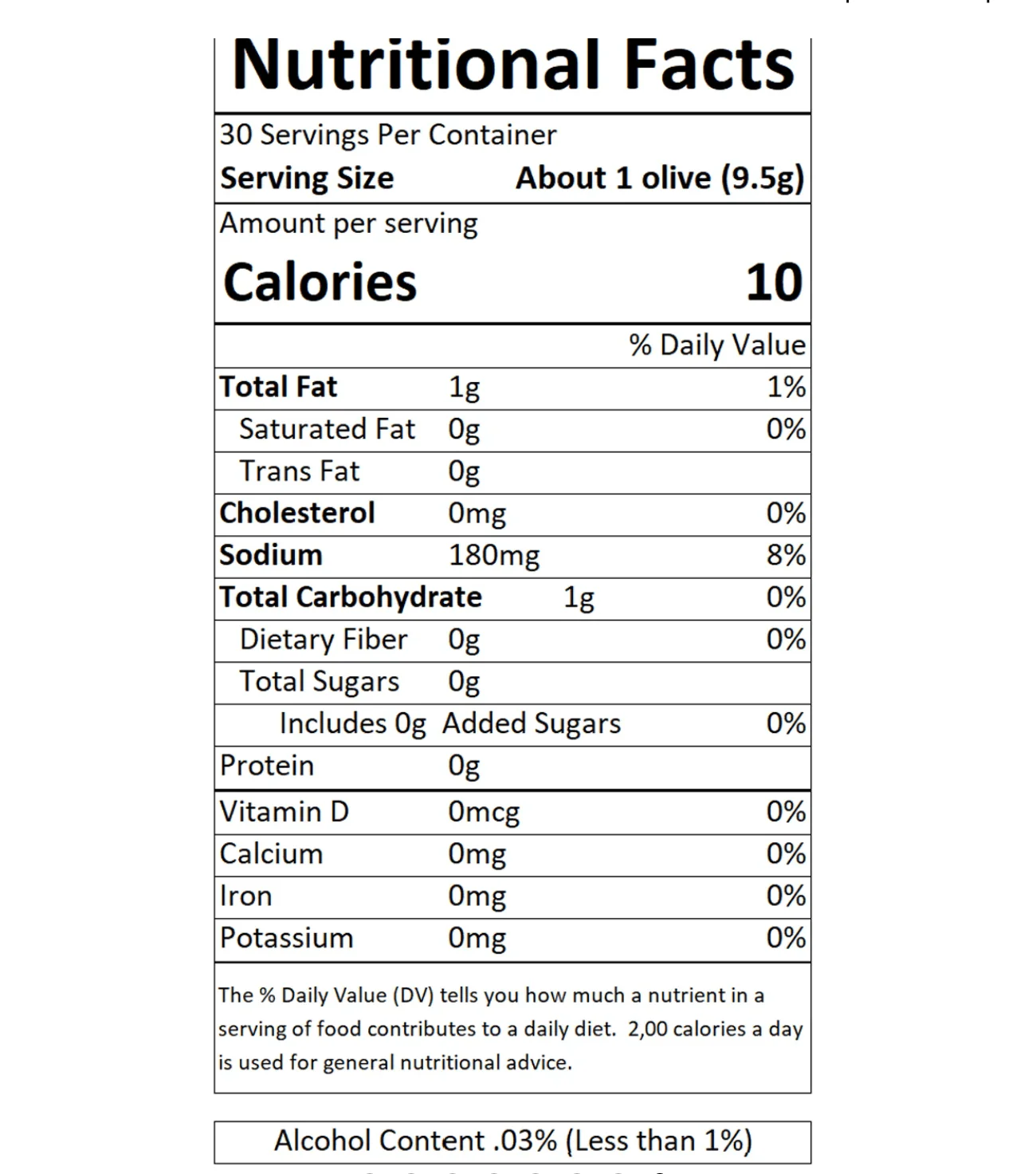 Green olive, water, minced pimento (sodium alginate, guar gum, calcium chloride, potassium sorbate (preservative)), salt, lactic acid, sodium benzoate (preservative), vermouth.